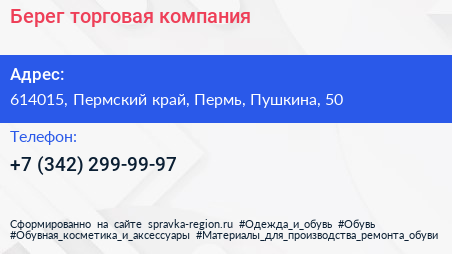 Берег, торговая компания по адресу 614015, Пермский край, Пермь, Пушкина, 50 в дальнейшем Организация, размещена в следующих категориях: