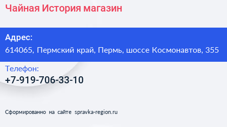 Чайная История, магазин по адресу 614065, Пермский край, Пермь, шоссе Космонавтов, 355 в дальнейшем Организация, размещена в следующих категориях: