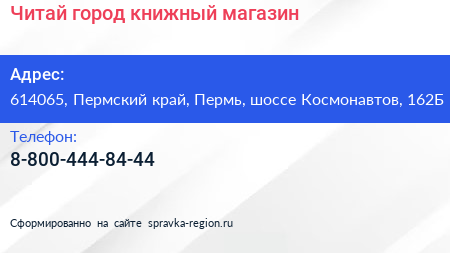 Читай город, книжный магазин по адресу 614065, Пермский край, Пермь, шоссе Космонавтов, 162Б в дальнейшем Организация, размещена в следующих категориях: