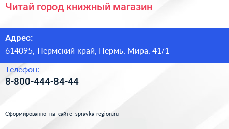 Читай город, книжный магазин по адресу 614095, Пермский край, Пермь, Мира, 41/1 в дальнейшем Организация, размещена в следующих категориях: