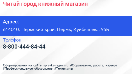 Читай город, книжный магазин по адресу 614010, Пермский край, Пермь, Куйбышева, 95Б в дальнейшем Организация, размещена в следующих категориях: