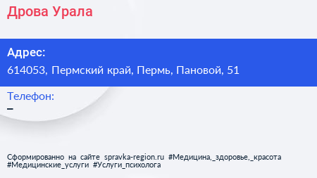 Дрова Урала по адресу 614053, Пермский край, Пермь, Пановой, 51 в дальнейшем Организация, размещена в следующих категориях: