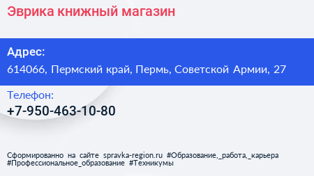 Эврика, книжный магазин по адресу 614066, Пермский край, Пермь, Советской Армии, 27 в дальнейшем Организация, размещена в следующих категориях: