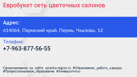 Евробукет, сеть цветочных салонов по адресу 614064, Пермский край, Пермь, Чкалова, 12 в дальнейшем Организация, размещена в следующих категориях: