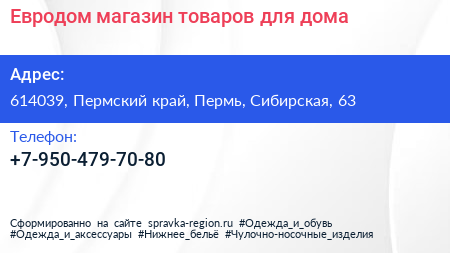 Евродом, магазин товаров для дома по адресу 614039, Пермский край, Пермь, Сибирская, 63 в дальнейшем Организация, размещена в следующих категориях: