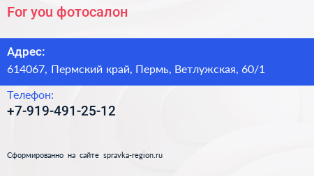 For you, фотосалон по адресу 614067, Пермский край, Пермь, Ветлужская, 60/1 в дальнейшем Организация, размещена в следующих категориях: