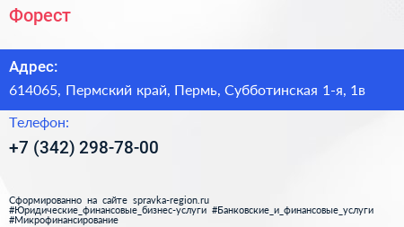Форест по адресу 614065, Пермский край, Пермь, Субботинская 1-я, 1в в дальнейшем Организация, размещена в следующих категориях: