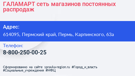 ГАЛАМАРТ, сеть магазинов постоянных распродаж по адресу 614095, Пермский край, Пермь, Карпинского, 63а в дальнейшем Организация, размещена в следующих категориях: