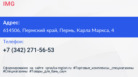 IMG+ по адресу 614506, Пермский край, Пермь, Карла Маркса, 4 в дальнейшем Организация, размещена в следующих категориях:
