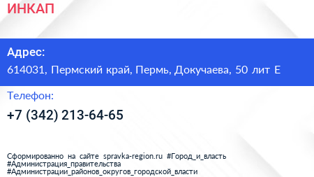ИНКАП по адресу 614031, Пермский край, Пермь, Докучаева, 50 лит Е в дальнейшем Организация, размещена в следующих категориях: