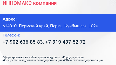 ИННОМАКС, компания по адресу 614010, Пермский край, Пермь, Куйбышева, 109а в дальнейшем Организация, размещена в следующих категориях: