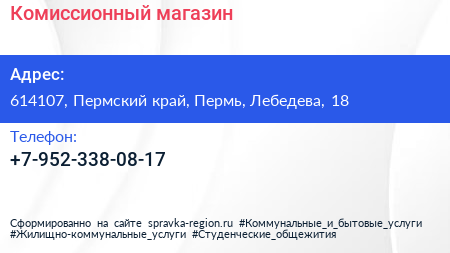 Комиссионный магазин по адресу 614107, Пермский край, Пермь, Лебедева, 18 в дальнейшем Организация, размещена в следующих категориях: