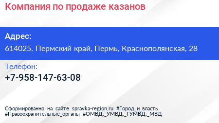 Компания по продаже казанов по адресу 614025, Пермский край, Пермь, Краснополянская, 28 в дальнейшем Организация, размещена в следующих категориях: