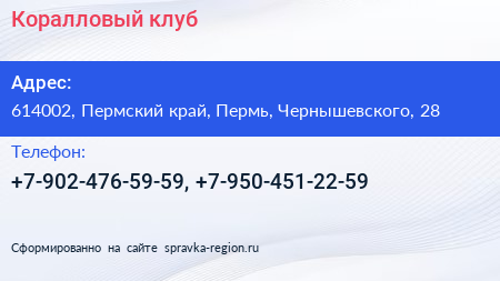 Коралловый клуб по адресу 614002, Пермский край, Пермь, Чернышевского, 28 в дальнейшем Организация, размещена в следующих категориях: