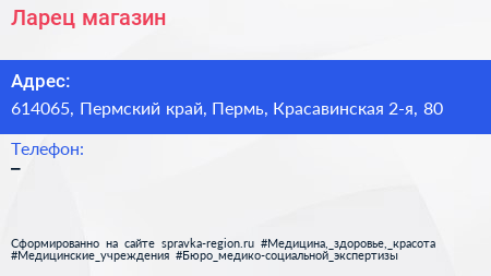 Ларец, магазин по адресу 614065, Пермский край, Пермь, Красавинская 2-я, 80 в дальнейшем Организация, размещена в следующих категориях: