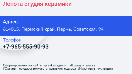 Лепота, студия керамики по адресу 614015, Пермский край, Пермь, Советская, 94 в дальнейшем Организация, размещена в следующих категориях: