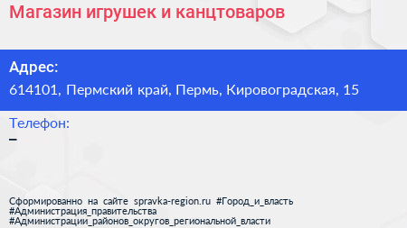Магазин игрушек и канцтоваров по адресу 614101, Пермский край, Пермь, Кировоградская, 15 в дальнейшем Организация, размещена в следующих категориях: