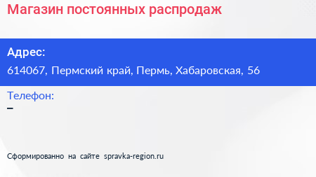 Магазин постоянных распродаж по адресу 614067, Пермский край, Пермь, Хабаровская, 56 в дальнейшем Организация, размещена в следующих категориях: