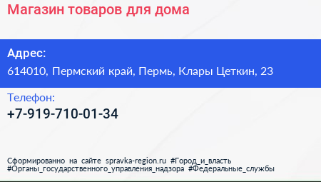 Магазин товаров для дома по адресу 614010, Пермский край, Пермь, Клары Цеткин, 23 в дальнейшем Организация, размещена в следующих категориях: