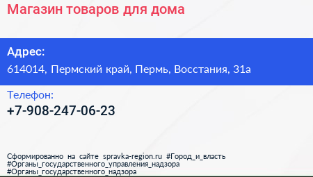 Магазин товаров для дома по адресу 614014, Пермский край, Пермь, Восстания, 31а в дальнейшем Организация, размещена в следующих категориях: