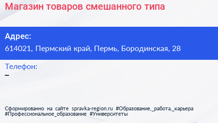 Магазин товаров смешанного типа по адресу 614021, Пермский край, Пермь, Бородинская, 28 в дальнейшем Организация, размещена в следующих категориях: