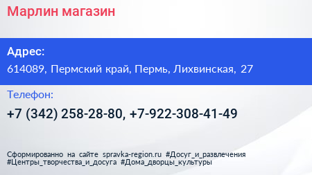 Марлин, магазин по адресу 614089, Пермский край, Пермь, Лихвинская, 27 в дальнейшем Организация, размещена в следующих категориях: