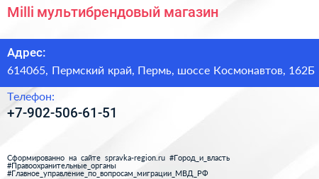 Milli, мультибрендовый магазин по адресу 614065, Пермский край, Пермь, шоссе Космонавтов, 162Б в дальнейшем Организация, размещена в следующих категориях:
