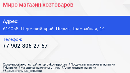 Миро, магазин хозтоваров по адресу 614058, Пермский край, Пермь, Трамвайная, 14 в дальнейшем Организация, размещена в следующих категориях: