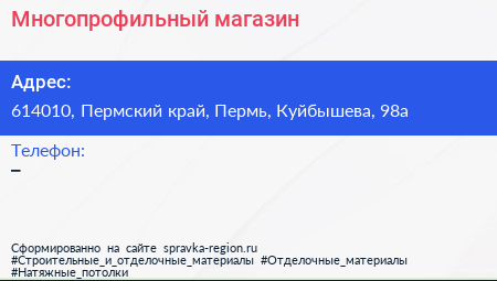 Многопрофильный магазин по адресу 614010, Пермский край, Пермь, Куйбышева, 98а в дальнейшем Организация, размещена в следующих категориях: