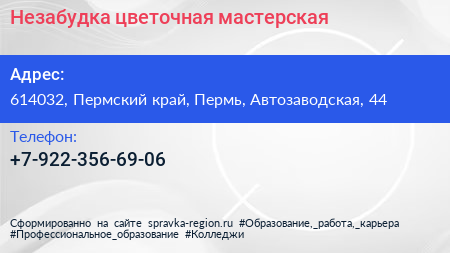 Незабудка, цветочная мастерская по адресу 614032, Пермский край, Пермь, Автозаводская, 44 в дальнейшем Организация, размещена в следующих категориях: