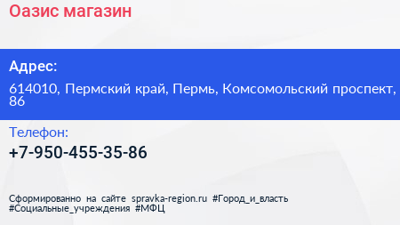 Оазис, магазин по адресу 614010, Пермский край, Пермь, Комсомольский проспект, 86 в дальнейшем Организация, размещена в следующих категориях: