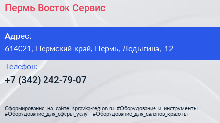 Пермь-Восток-Сервис по адресу 614021, Пермский край, Пермь, Лодыгина, 12 в дальнейшем Организация, размещена в следующих категориях: