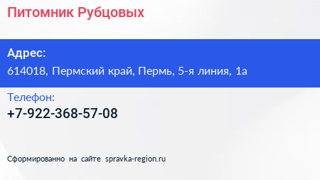 Питомник Рубцовых по адресу 614018, Пермский край, Пермь, 5-я линия, 1а в дальнейшем Организация, размещена в следующих категориях: