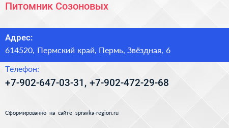 Питомник Созоновых по адресу 614520, Пермский край, Пермь, Звёздная, 6 в дальнейшем Организация, размещена в следующих категориях: