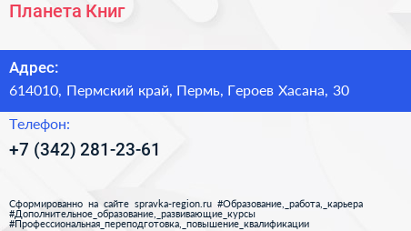 Планета Книг по адресу 614010, Пермский край, Пермь, Героев Хасана, 30 в дальнейшем Организация, размещена в следующих категориях: