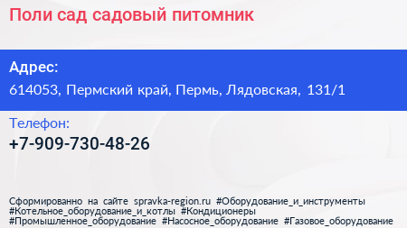 Поли-сад, садовый питомник по адресу 614053, Пермский край, Пермь, Лядовская, 131/1 в дальнейшем Организация, размещена в следующих категориях: