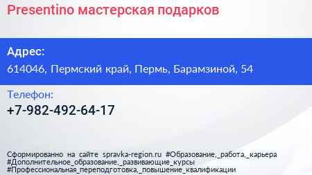 Presentino, мастерская подарков по адресу 614046, Пермский край, Пермь, Барамзиной, 54 в дальнейшем Организация, размещена в следующих категориях: