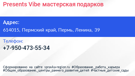Presents Vibe, мастерская подарков по адресу 614015, Пермский край, Пермь, Ленина, 39 в дальнейшем Организация, размещена в следующих категориях: