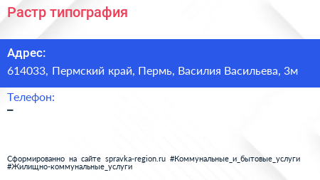 Растр, типография по адресу 614033, Пермский край, Пермь, Василия Васильева, 3м в дальнейшем Организация, размещена в следующих категориях: