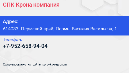 СПК-Крона, компания по адресу 614033, Пермский край, Пермь, Василия Васильева, 1 в дальнейшем Организация, размещена в следующих категориях:
