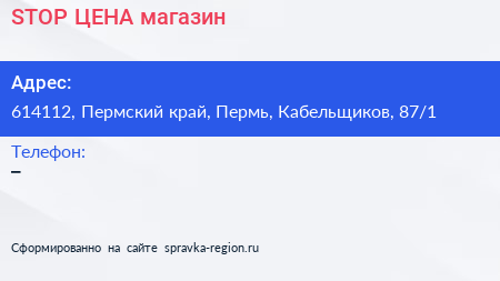 STOP! ЦЕНА, магазин по адресу 614112, Пермский край, Пермь, Кабельщиков, 87/1 в дальнейшем Организация, размещена в следующих категориях:
