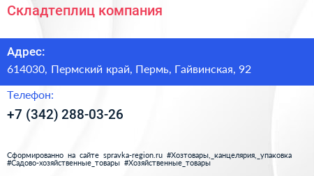 Складтеплиц, компания по адресу 614030, Пермский край, Пермь, Гайвинская, 92 в дальнейшем Организация, размещена в следующих категориях: