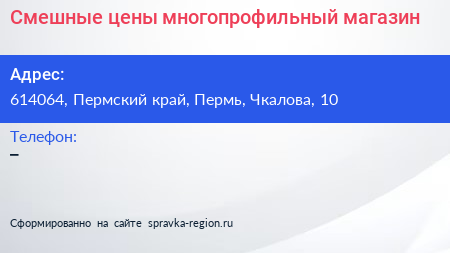 Смешные цены, многопрофильный магазин по адресу 614064, Пермский край, Пермь, Чкалова, 10 в дальнейшем Организация, размещена в следующих категориях: