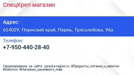 СпецКреп, магазин по адресу 614029, Пермский край, Пермь, Трясолобова, 96а в дальнейшем Организация, размещена в следующих категориях: