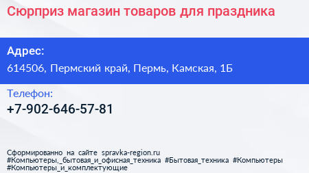 Сюрприз, магазин товаров для праздника по адресу 614506, Пермский край, Пермь, Камская, 1Б в дальнейшем Организация, размещена в следующих категориях: