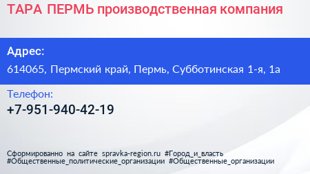 ТАРА-ПЕРМЬ, производственная компания по адресу 614065, Пермский край, Пермь, Субботинская 1-я, 1а в дальнейшем Организация, размещена в следующих категориях: