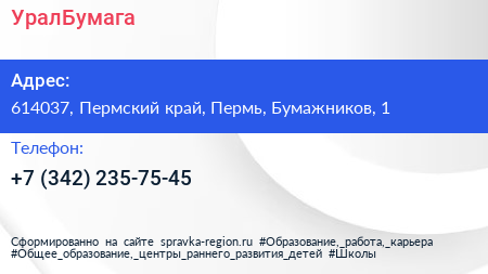 УралБумага по адресу 614037, Пермский край, Пермь, Бумажников, 1 в дальнейшем Организация, размещена в следующих категориях: