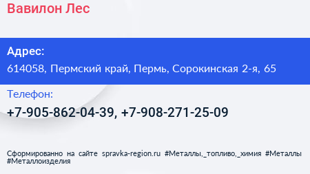 Вавилон Лес по адресу 614058, Пермский край, Пермь, Сорокинская 2-я, 65 в дальнейшем Организация, размещена в следующих категориях: