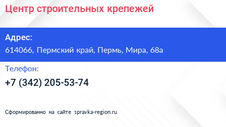 Центр строительных крепежей по адресу 614066, Пермский край, Пермь, Мира, 68а в дальнейшем Организация, размещена в следующих категориях:
