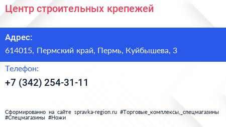 Центр строительных крепежей по адресу 614015, Пермский край, Пермь, Куйбышева, 3 в дальнейшем Организация, размещена в следующих категориях: